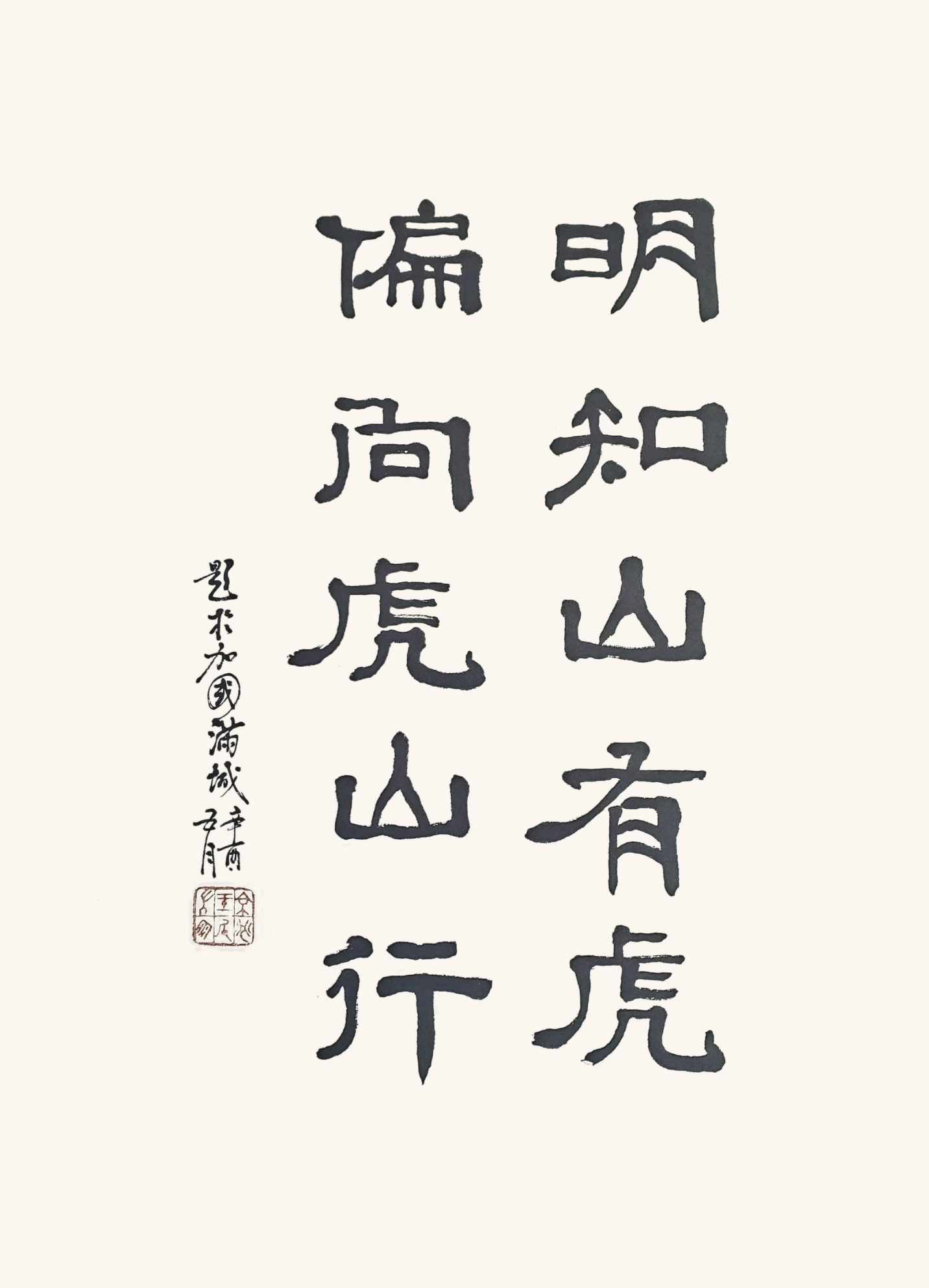 Chinese calligraphy by Wang Bingzhang. The Chinese proverb translates to: “I know there are tigers in the mountain. And still towards the mountain I go.”